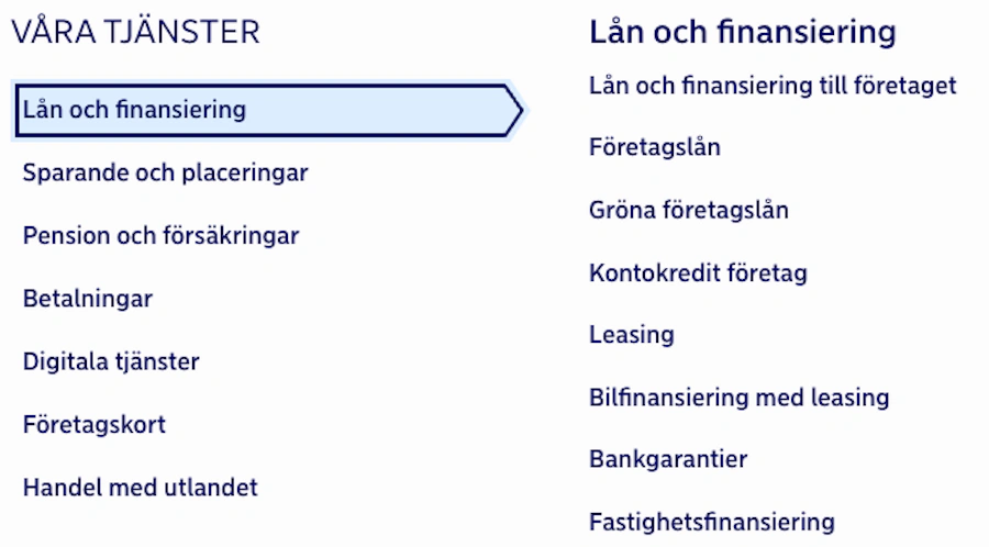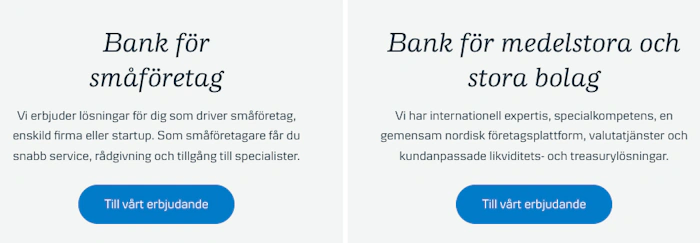 Nordea är en stor spelare när det kommer till företagstjänster och vi förstår varför. De täcker helt enkelt in det mesta som man kan förvänta sig av en modern företagsbank idag. Här finns ett stort antal olika företagslån, kontokredit, leasing, bankgarantier och mer därtill.