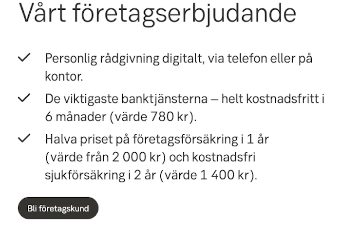 På deras företagssida har de valt att trycka lite extra på att de är en digital bank i framkant och de har lagt mycket krut på deras företagsapp. Något som de också gärna lyfter fram är att de ger rådgivning för hur du kan få ditt företags kapital att växa.